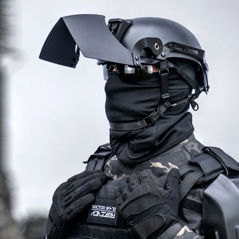 Fabriquée en alliage NovaSteel de haute qualité, la mandibule est à la fois résistante aux impacts balistiques tout en restant très légère, pesant moins de 450 grammes. Le mécanisme d’articulation scellé assure un fonctionnement silencieux et maîtrisé, sans cliquetis, bruit de verrouillage ou d’attache pouvant compromettre la discrétion ou la position de l’utilisateur. Sa géométrie profilée préserve un large champ de vision et s’accorde parfaitement avec la plupart des lunettes balistiques, masques et optiques d’armes classiques. Elle offre une protection multi-menaces contre les impacts balistiques de calibre pistolet, les éclats à haute vélocité, les chocs contondants et les débris.