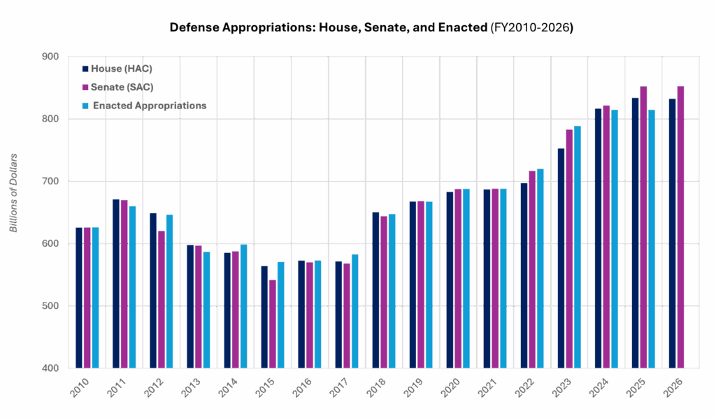 Historiquement, de 2012 à 2021, les plafonds instaurés par le Budget Control Act avaient uniformisé les niveaux d’engagements entre les deux chambres, imposant des limites strictes aux dépenses de défense. Depuis la fin de ces plafonds, sauf exceptions en 2024-2025, les écarts se sont accentués.