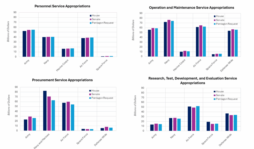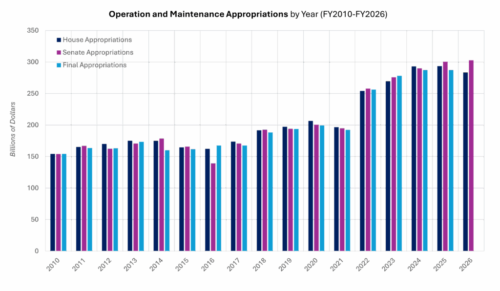 Fonctionnement et maintenance : C’est là que les divergences sont les plus fortes, avec un écart de près de 18 milliards entre les projets de la Chambre et du Sénat. Le Sénat ajoute des crédits pour soutenir les installations et la modernisation, tandis que la Chambre réduit certains postes, y compris un important plan de réduction des emplois civils, tout en surfinançant la main-d’œuvre des acquisitions.