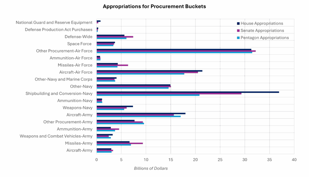 Au-delà des lignes budgétaires globales, les deux chambres différencient leurs choix sectoriels. La Chambre soutient pleinement les priorités présidentielles, notamment en renforçant les acquisitions et innovations pour la Marine et la Space Force. Elle privilégie les capacités de nouvelle génération : hypersonique, systèmes sans pilote, modernisation nucléaire et construction navale.