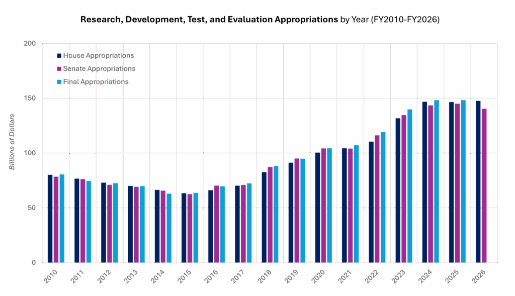 Recherche, développement, essais et évaluation : La Chambre propose un budget record (148 milliards $), porteur d’une volonté d’innovation accélérée. Elle cible les systèmes sans pilotes, la défense antimissile et la modernisation nucléaire, avec une forte allocation aux programmes classifiés de la Space Force. Le Sénat montre plus de réserve, notamment en coupant certains programmes spatiaux jugés dupliqués ou immatures, tout en renforçant des projets plus mûrs et les capacités industrielles.