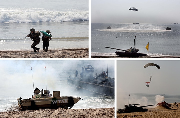 Les opérations à grande échelle se sont déroulées dans les secteurs des estuaires et du désert du Rajasthan et du Gujarat, ainsi que dans le domaine maritime, incluant des opérations amphibies dans le nord de la mer d’Arabie. La Garde côtière indienne, la Force de sécurité des frontières et d’autres agences centrales ont également pris part à l’exercice, renforçant ainsi la coordination inter-agences et les opérations intégrées.