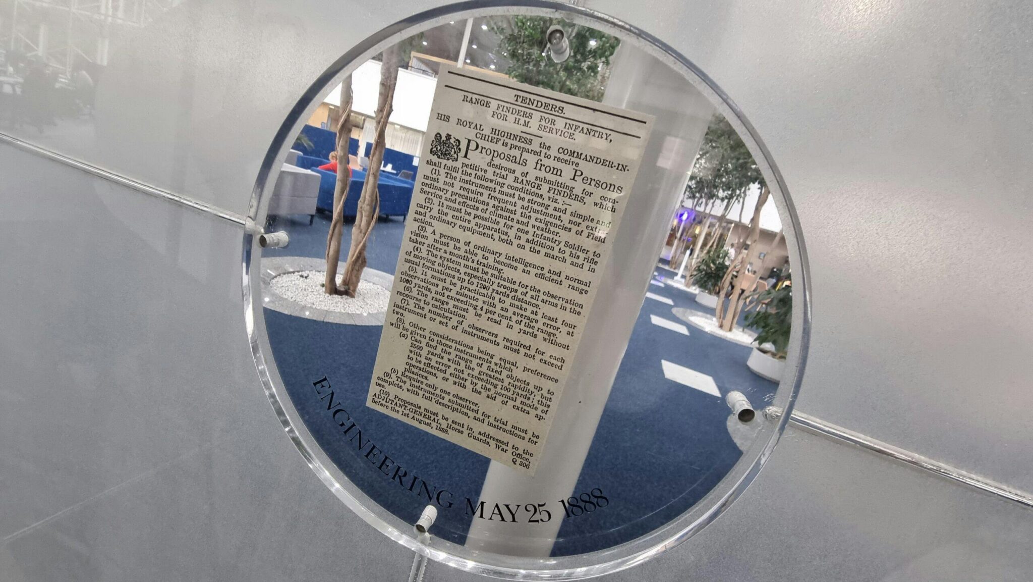 « Voici la toute première publicité parue dans l’Engineering Magazine de mai 1818 », a-t-il expliqué avec fierté dans le hall d’accueil, « un appel d’offres du War Office sollicitant des propositions de télémètres pour l’infanterie. Le troisième paragraphe précise que n’importe quelle personne d’intelligence ordinaire et de vision normale doit pouvoir devenir un tireur efficace après un mois d’entraînement. »