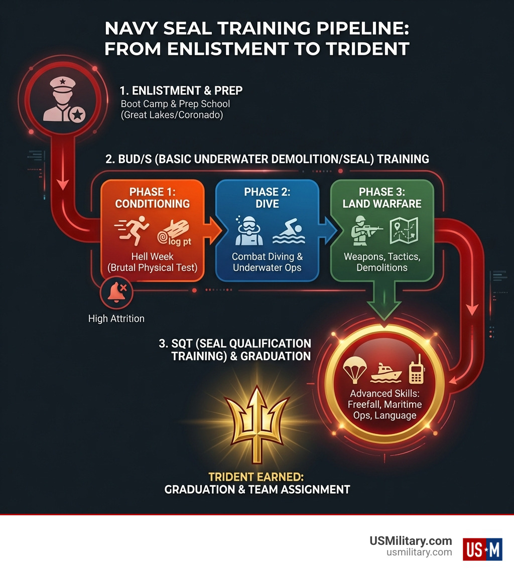 - SEAL Qualification Training (SQT) (26 semaines) : formation avancée couvrant armes, tactiques, navigation, démolition, entraînement au froid, médecine de combat, opérations maritimes, techniques de survie, d’évasion et de résistance. À l’issue, la remise de l’insigne Trident officialise le statut de Navy SEAL.