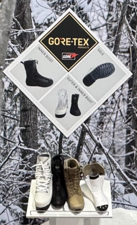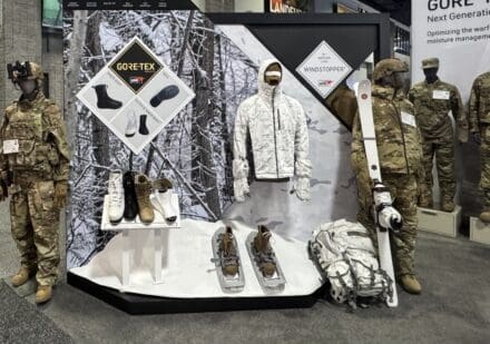 Au salon AUSA, le stand de la marque GORE-TEX exposait une large gamme d’équipements pour conditions hivernales extrêmes. Parmi ceux-ci, on pouvait découvrir à gauche du stand la botte Meindl GORE-TEX ECWCS, conçue pour affronter le grand froid.