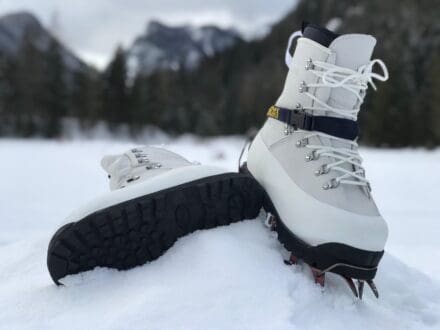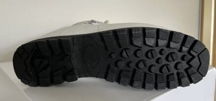 La botte extérieure est fabriquée en EXTRAGUARD, un tissu synthétique développé par W.L. Gore & Assoc. qui présente une résistance comparable à celle du cuir tout en ne retenant pas l’humidité. Cela en fait un choix idéal pour les environnements froids, notamment lorsqu’ils connaissent des périodes alternées de mouillé et de gel. La bande de protection autour de la semelle est large et en caoutchouc, ce qui protège efficacement la botte contre les coupures causées par les crampons. Cette construction rigide permet également une bonne intégration avec les crampons, raquettes à neige et skis.