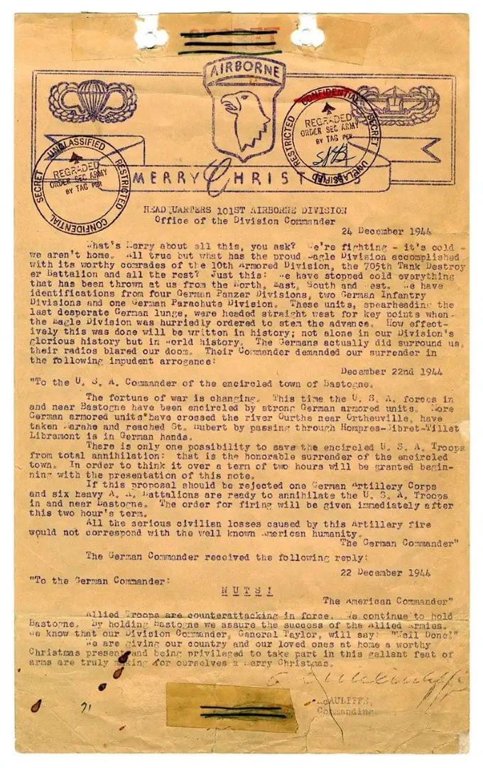 Le 22 décembre 1944, encerclée par les forces allemandes durant la Bataille des Ardennes, la 101e division aéroportée américaine, sous le commandement intérimaire du général de brigade McAuliffe, reçoit un message du général allemand Heinrich Freiherr von Lüttwitz, transmis sous pavillon blanc.