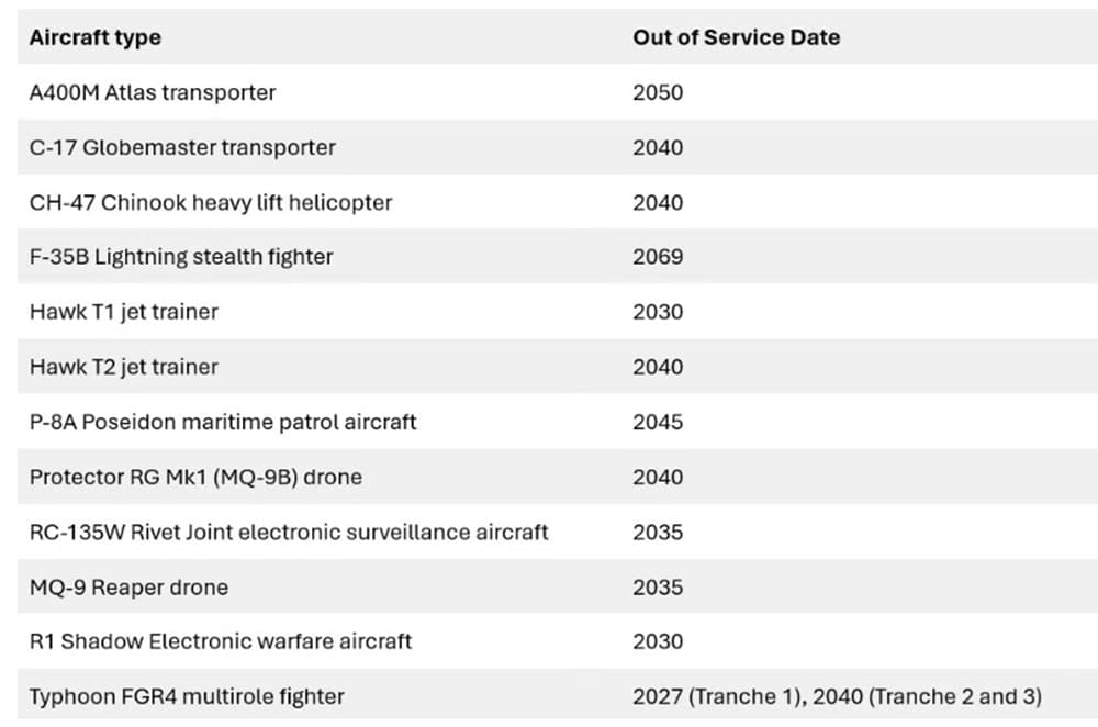 Contrairement aux armées de terre et navale, la Royal Air Force (RAF) est engagée dans un processus de renouvellement actif, ayant déjà intégré de nouveaux chasseurs, avions de patrouille maritime, transporteurs stratégiques et plateformes de guerre électronique.