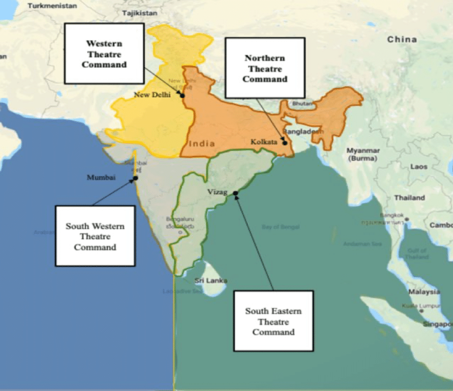 Le CoSC a largement finalisé la création de trois Commandements conjoints ou théâtraux : deux axes terrestres orientés chacun vers un adversaire spécifique, et un commandement maritime. Le Commandement du Théâtre Nord, concentré sur la menace chinoise, devrait être basé à Lucknow. Le Commandement du Théâtre Ouest, focalisé sur le Pakistan, serait implanté à Jaipur. Enfin, un Commandement maritime, chargé des intérêts stratégiques maritimes de l’Inde, serait installé à Thiruvananthapuram.