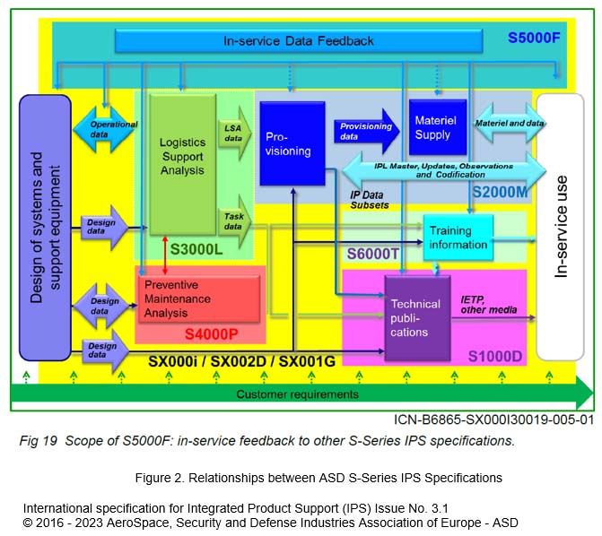 La série S des spécifications IPS éditée par l’Association des industries aérospatiales et de défense d’Europe (ASD) et son homologue américaine couvre l’ensemble des aspects du support produit intégré. Le document principal, SX000i version 3.1, comprend plus de 600 pages ; il est recommandé de commencer par les chapitres introductifs. Les interactions entre spécifications sont illustrées notamment par :