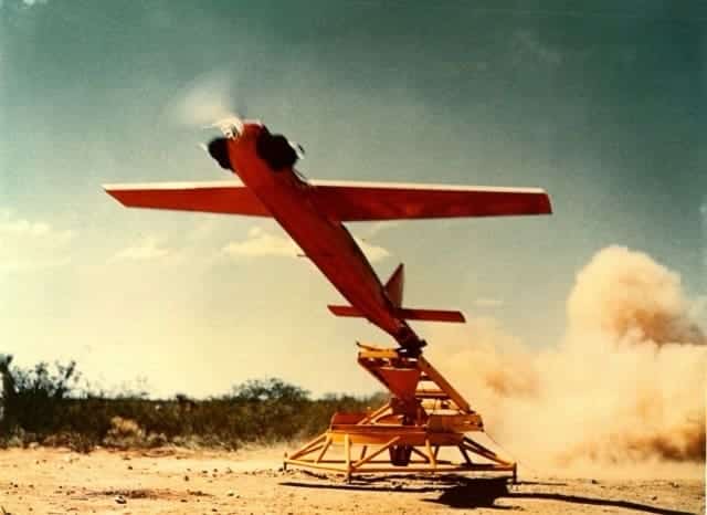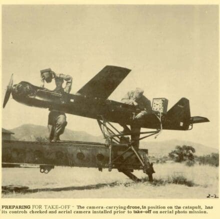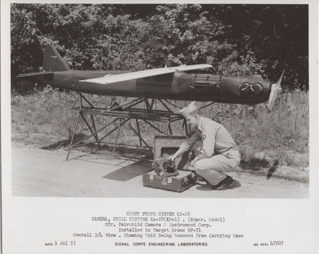 Le Signal Corps a développé un nouveau drone équipé d’une caméra, capable de fournir au commandant de combat des photographies aériennes en première ligne en moins d’une heure et sans risque pour le personnel. Ce drone, un avion cible télécommandé, a été équipé pour sa mission de surveillance aérienne au sein du Centre d’essais électroniques de l’armée (Fort Huachuca, Arizona). Il peut voler à plus de 320 km/h et monter à plusieurs milliers de pieds par minute. Bien que son décollage soit assisté par réacteur, il est propulsé en vol par un moteur à essence entraînant une hélice. Equipé d’appareils photo fixes et de caméras cinématographiques, il offre une couverture photographique aérienne à des altitudes allant de quelques centaines de pieds à plus de quatre milles.