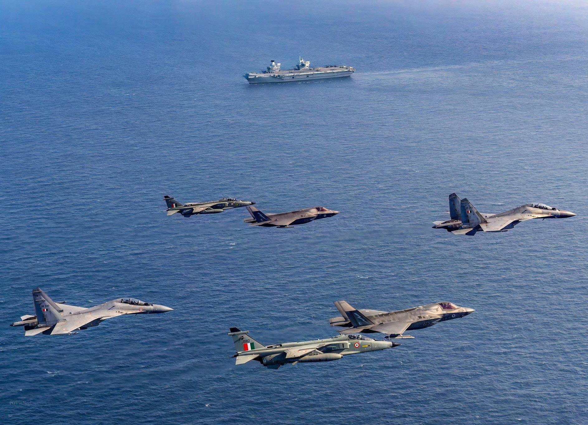 Mené par le HMS Prince of Wales, le groupe de combat est parti de Goa et Mumbai après une semaine d’échanges destinés à promouvoir l’industrie britannique et à consolider les liens dans le domaine de la défense. La composante aérienne comprenait six avions F-35B Lightning II assurant la défense du porte-avions face à une douzaine d’appareils de l’Indian Air Force, dont huit Sukhoï Su-30MKI Flanker, quatre Jaguars et une plateforme d’alerte avancée aéroportée Il-78 Mainstay.