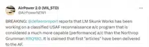 Le 3 novembre, lors du dernier épisode du « Defense and Aerospace Power Podcast », Vago Muradian et JJ Gertler, analyste senior du Teal Group, ont dévoilé l’existence de ce mystérieux drone espion. Muradian a précisé qu’il s’agit d’un « avion de reconnaissance plus performant que le RQ-180 » et qu’une partie de ces appareils a déjà été remise à l’US Air Force. Néanmoins, ni le nombre exact ni l’avancement précis du programme n’ont été communiqués.