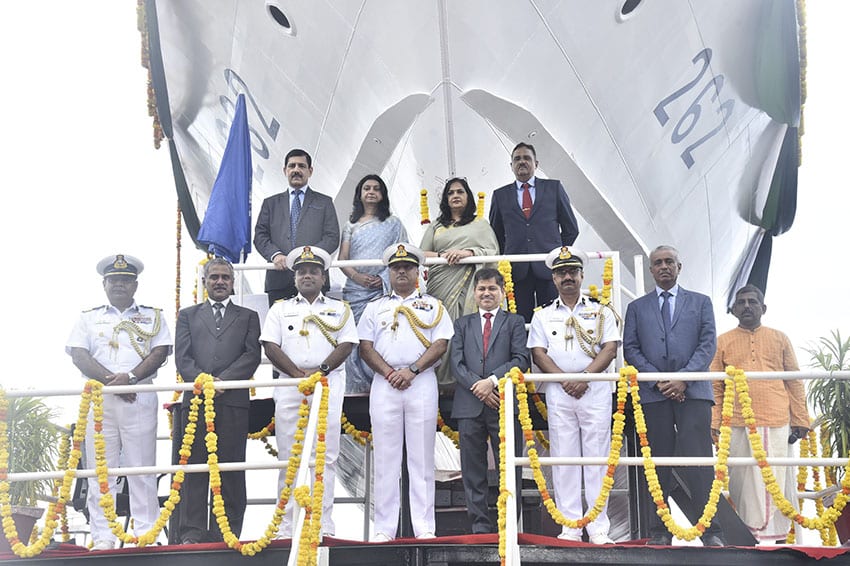 La cérémonie de lancement a été présidée par Mayank Sharma, conseiller financier pour les services de défense, en présence de Manju Sharma qui a procédé à la mise à l’eau des navires, ainsi que de l’inspecteur général Bhisham Sharma, commandant de la région Ouest de la Garde côtière, et de hauts responsables de la Garde côtière et de GSL.