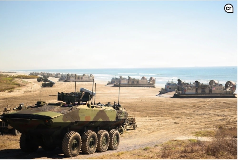 Plus de 35 aéronefs, dont des CH-53E Super Stallions, MV-22B Ospreys, KC-130J Hercules, ainsi que des F/A-18 et F-35, ont soutenu les Marines et marins lors d’une attaque synchronisée utilisant véhicules de combat amphibies, systèmes d’artillerie à roquettes mobiles à haute mobilité, systèmes d’interdiction navale de la Marine et du Corps des Marines, engins à coussin d’air pour les barges de débarquement et véhicules blindés légers.