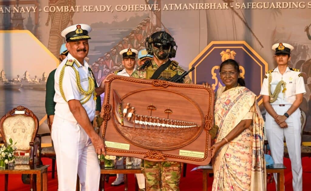 La cérémonie a été présidée par la Présidente de l’Inde, Droupadi Murmu, accueillie par le chef de la Marine, l’amiral Dinesh K Tripathi. Un garde d’honneur composé de 150 membres du personnel naval lui a rendu les honneurs à son arrivée.
