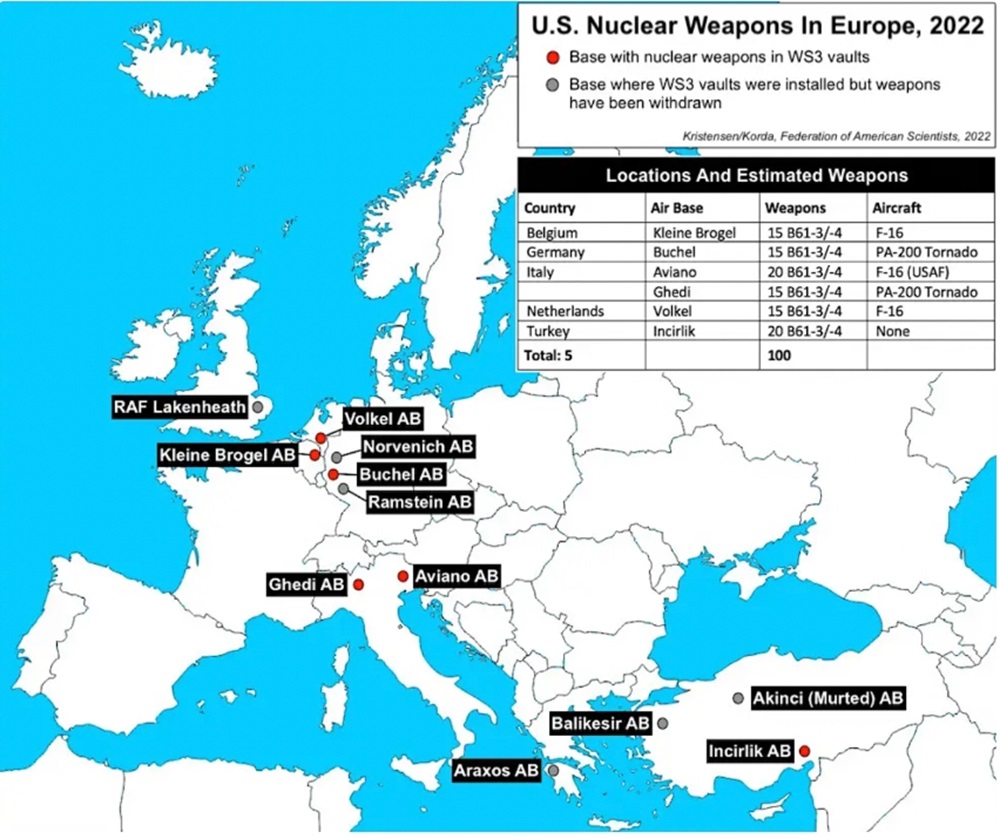 L’assortiment d’environ 150 anciennes bombes nucléaires de type B61 actuellement stockées dans six bases européennes devrait être remplacé par les variantes B61-12. Ces bases sont réparties entre la Belgique, l’Allemagne, l’Italie et les Pays-Bas. Aux Pays-Bas, la base aérienne néerlandaise de Volkel héberge entre dix et quinze bombes nucléaires B61 qui sont déployées par les F-16 de l’Armée de l’air royale néerlandaise (RNLAF).