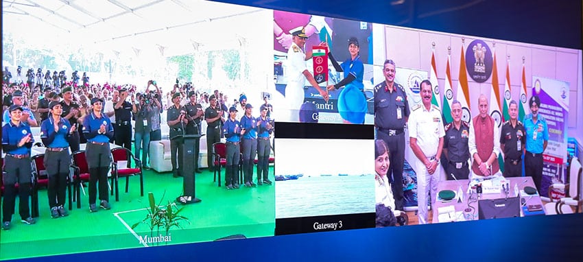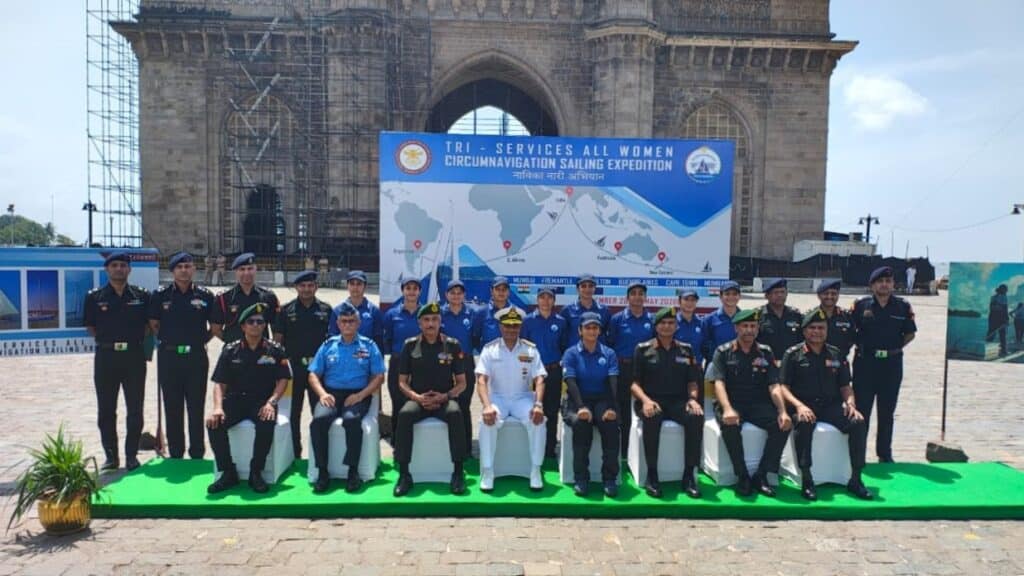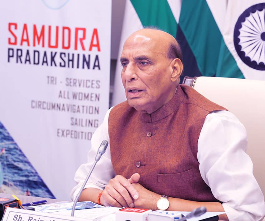 Le ministre de la Défense donne virtuellement le coup d’envoi de « Samudra Pradakshina », première expédition nautique mondiale tri-forces entièrement féminine depuis Mumbai.