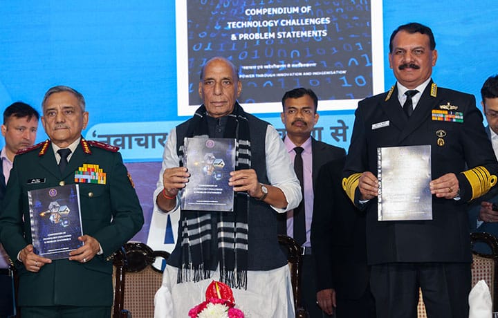 Le ministre a remis des distinctions à dix lauréats du programme iDEX et lancé plusieurs documents clés, dont le compendium des défis technologiques navals indiens, le document Swavlamban 4.0, ainsi qu’un recueil consacré à l’indigénisation des armements.