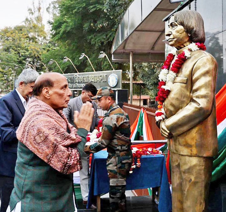 Avant la visite du laboratoire, M. Rajnath Singh s’est recueilli en rendant hommage floral à la statue de l’ancien président Bharat Ratna Dr APJ Abdul Kalam, située dans l’enceinte de l’établissement. Il a été accueilli par le secrétaire du Département de la Défense (R&D) et président de la DRDO, le Dr Samir V Kamat.