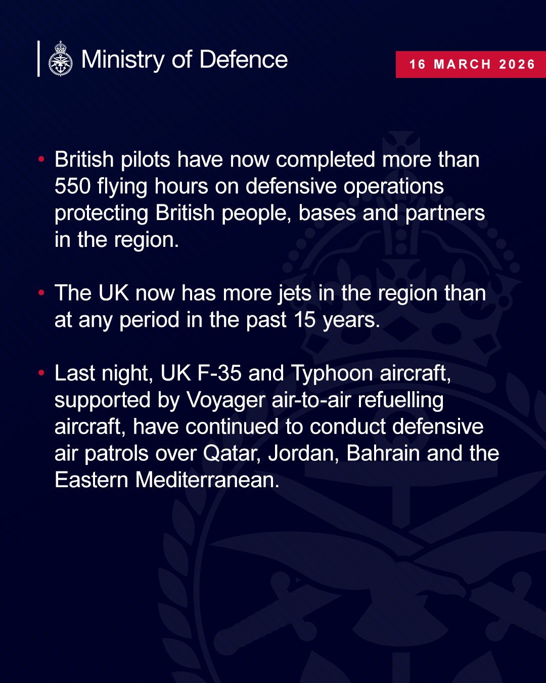 Le ministère a également confirmé que le Royaume-Uni déploie actuellement plus de chasseurs dans la région que lors de n’importe quel autre moment au cours des 15 dernières années.