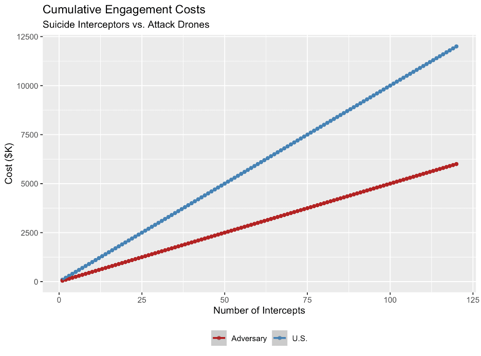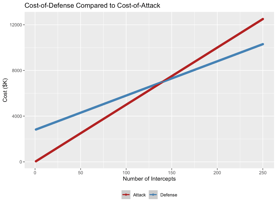 Le système VAMPIRE de L3Harris opposé à un drone Shahed-136 sert ici d’exemple. En supposant un taux d’engagement de 100 % et sans considérer les coûts opérationnels, la courbe des coûts pour le défenseur et l’attaquant se croise aux environs de 144 interceptions. Dans un conflit prolongé, la réutilisabilité et les munitions peu coûteuses amélioreraient ce ratio en faveur du défenseur.