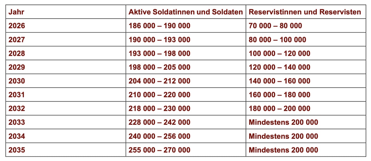 (1) À l’horizon 2035, les forces armées doivent compter 460 000 militaires, dont jusqu’à 260 000 actifs et au moins 200 000 réservistes pour remplir les objectifs de capacité de l’OTAN. Le cheminement de cette croissance est le suivant : »