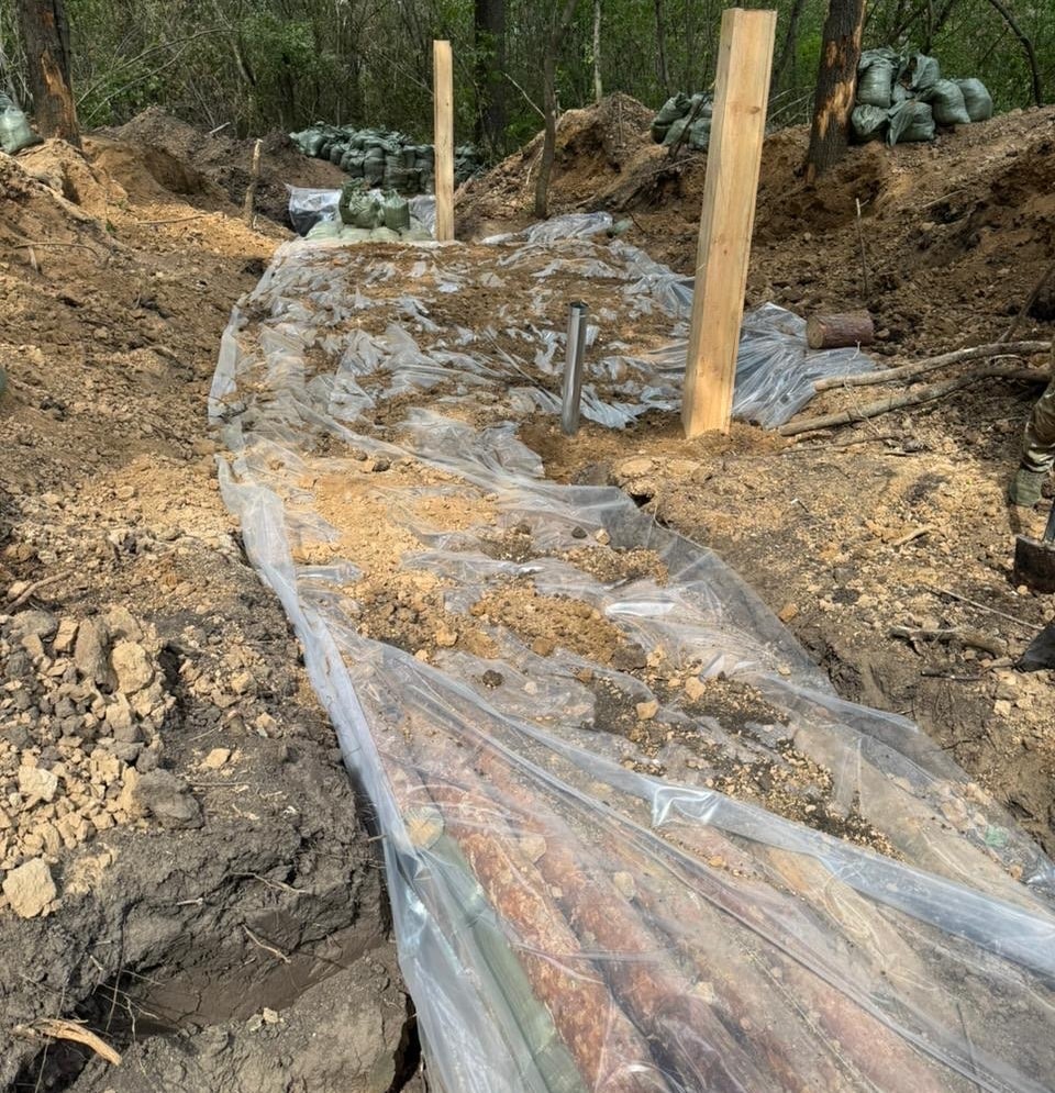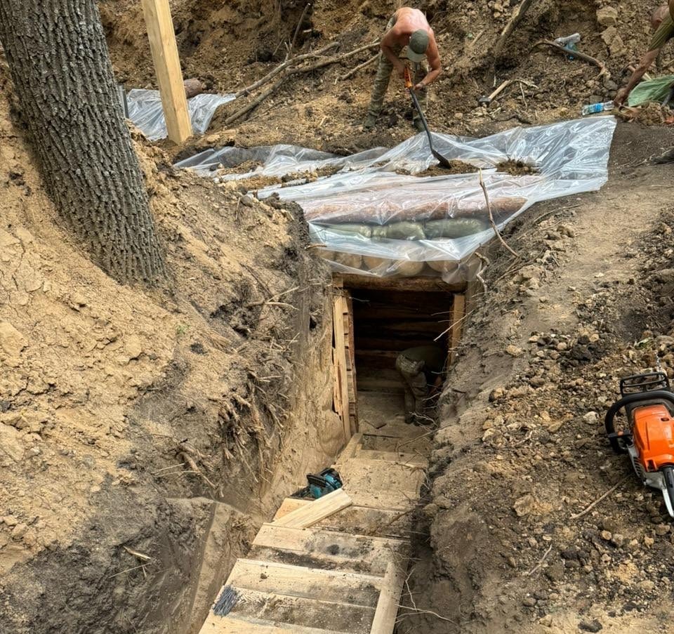 Illustration des efforts ukrainiens sur le terrain avec la construction de bunkers en collaboration avec les unités du génie et un peloton médical. Des photos récentes montrent la technique utilisée : un toit constitué initialement de troncs d’arbres, suivi de sacs de sable remplis, puis à nouveau de troncs, formant une couche d’environ un mètre d’épaisseur. Une bâche étanche est placée dessus avant d’être recouverte de terre, probablement masquée par un revêtement végétal pour dissimulation.