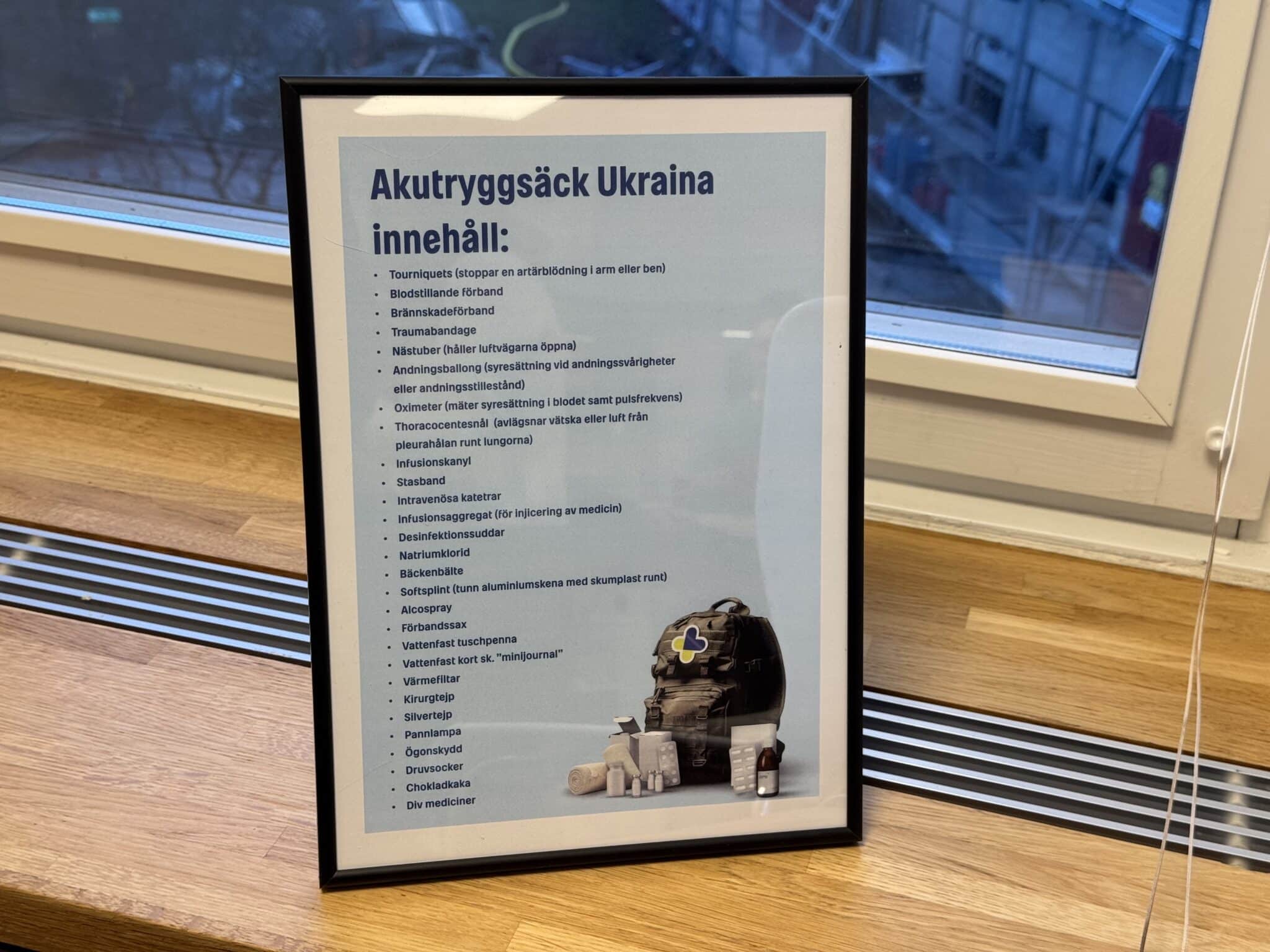 Par ailleurs, une action de solidarité a été organisée hier pour confectionner 200 sacs à dos médicaux de secours destinés aux équipes de secours en zone de combat ukrainiennes. Cette opération a réuni, entre autres, plusieurs donateurs importants et des acteurs du secteur financier suédois. Le contenu de ces sacs, élaboré en collaboration avec des secouristes ayant participé à des camps de réhabilitation en Suède, a été régulièrement adapté en fonction des évolutions du théâtre des opérations et des besoins médicaux constatés.