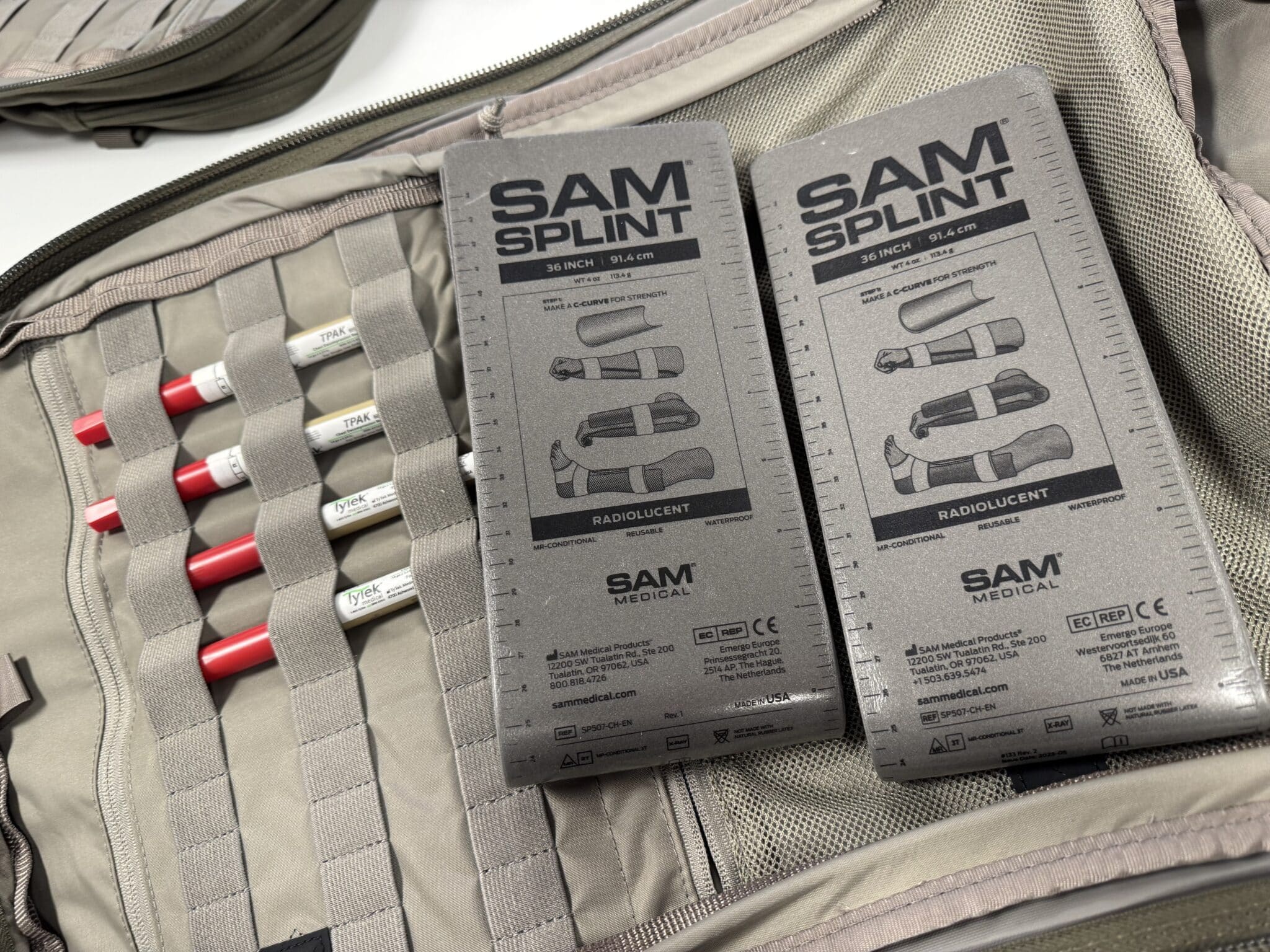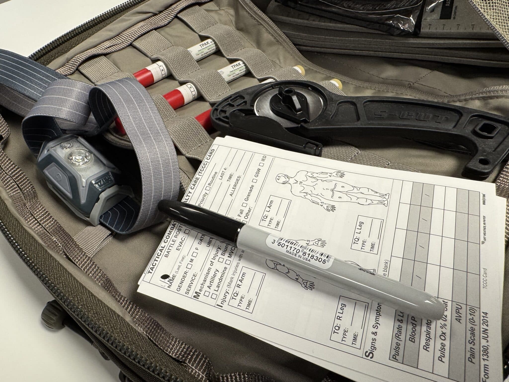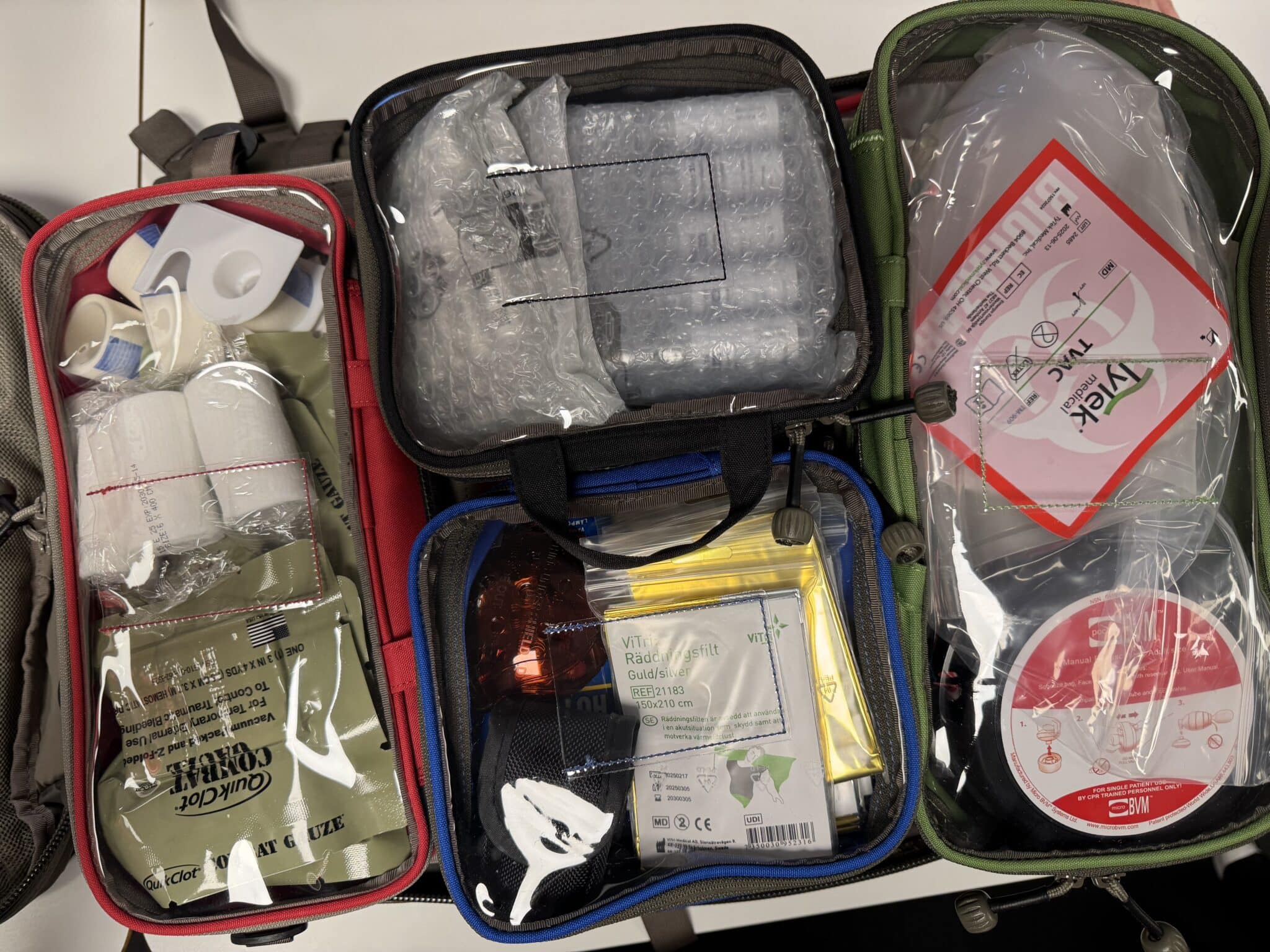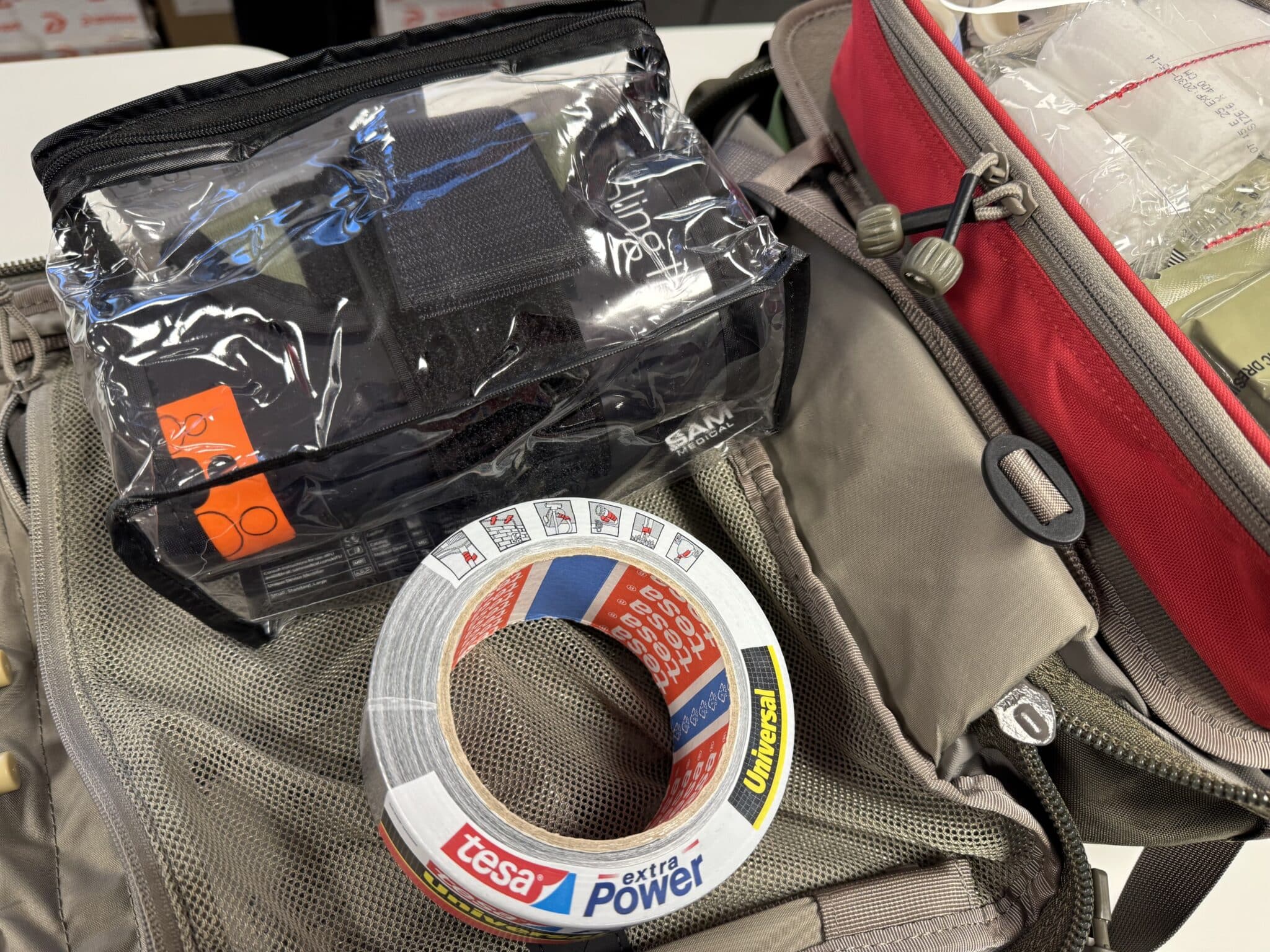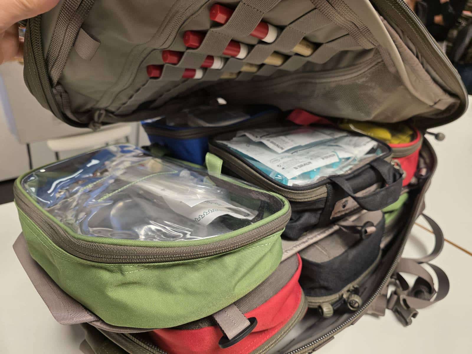 Chaque sac à dos contient deux sets complets de matériel médical répartis dans quatre pochettes : la poche verte pour la gestion des voies respiratoires, la rouge pour le contrôle des hémorragies, la bleue pour les médicaments, et la noire pour le support des injections. Ces équipements sont accompagnés de consommables à renouveler régulièrement, ainsi que d’éléments réutilisables comme du ruban adhésif robuste, des lampes frontales, des cartes de blessures et des couteaux specialisés permettant d’ôter rapidement les vêtements sans blesser le patient.