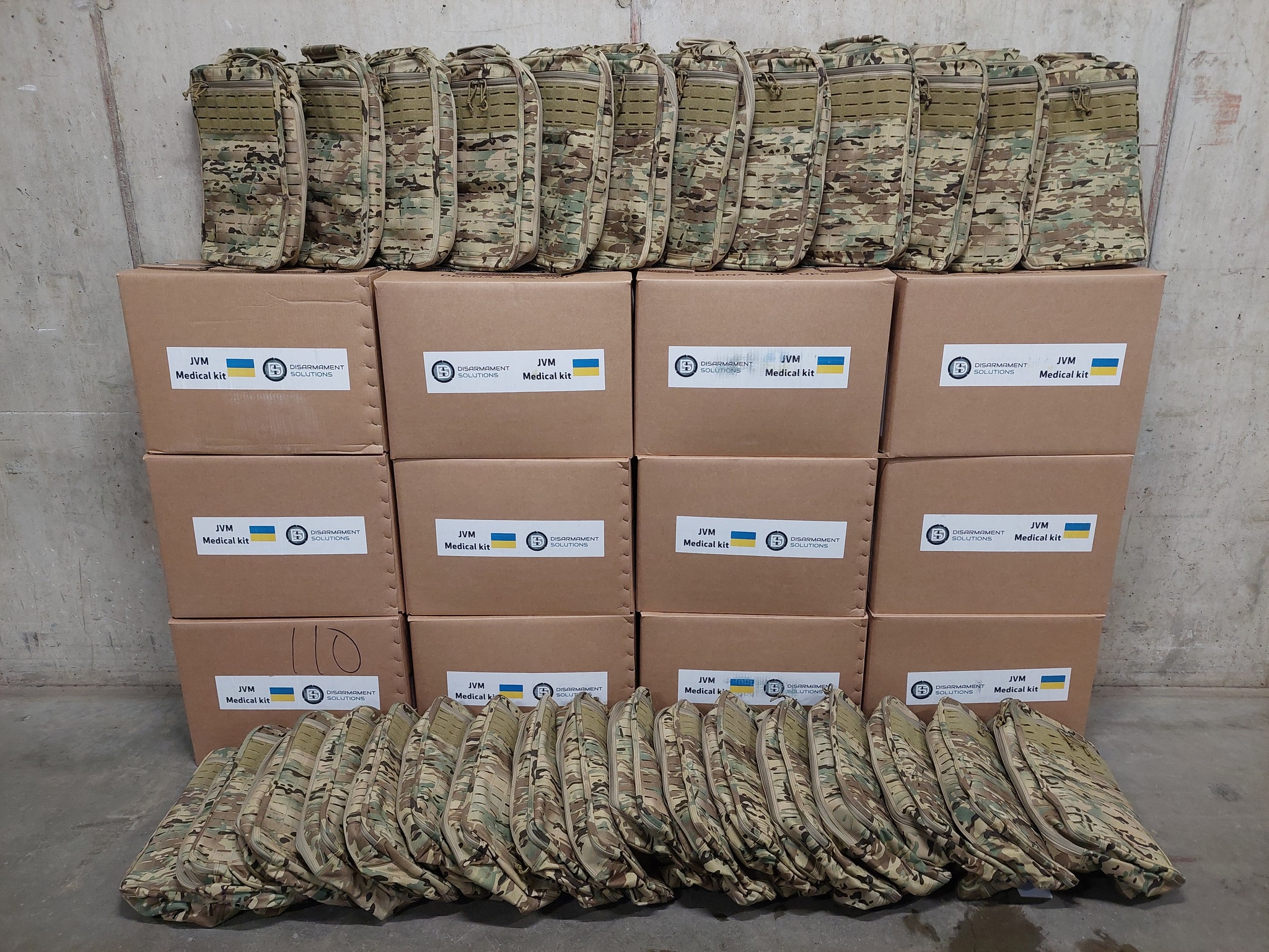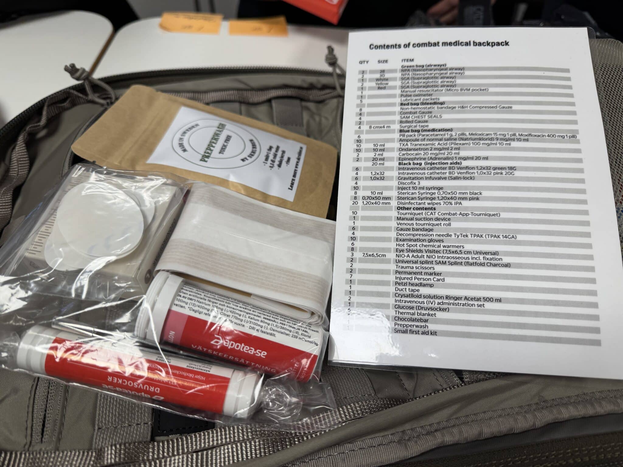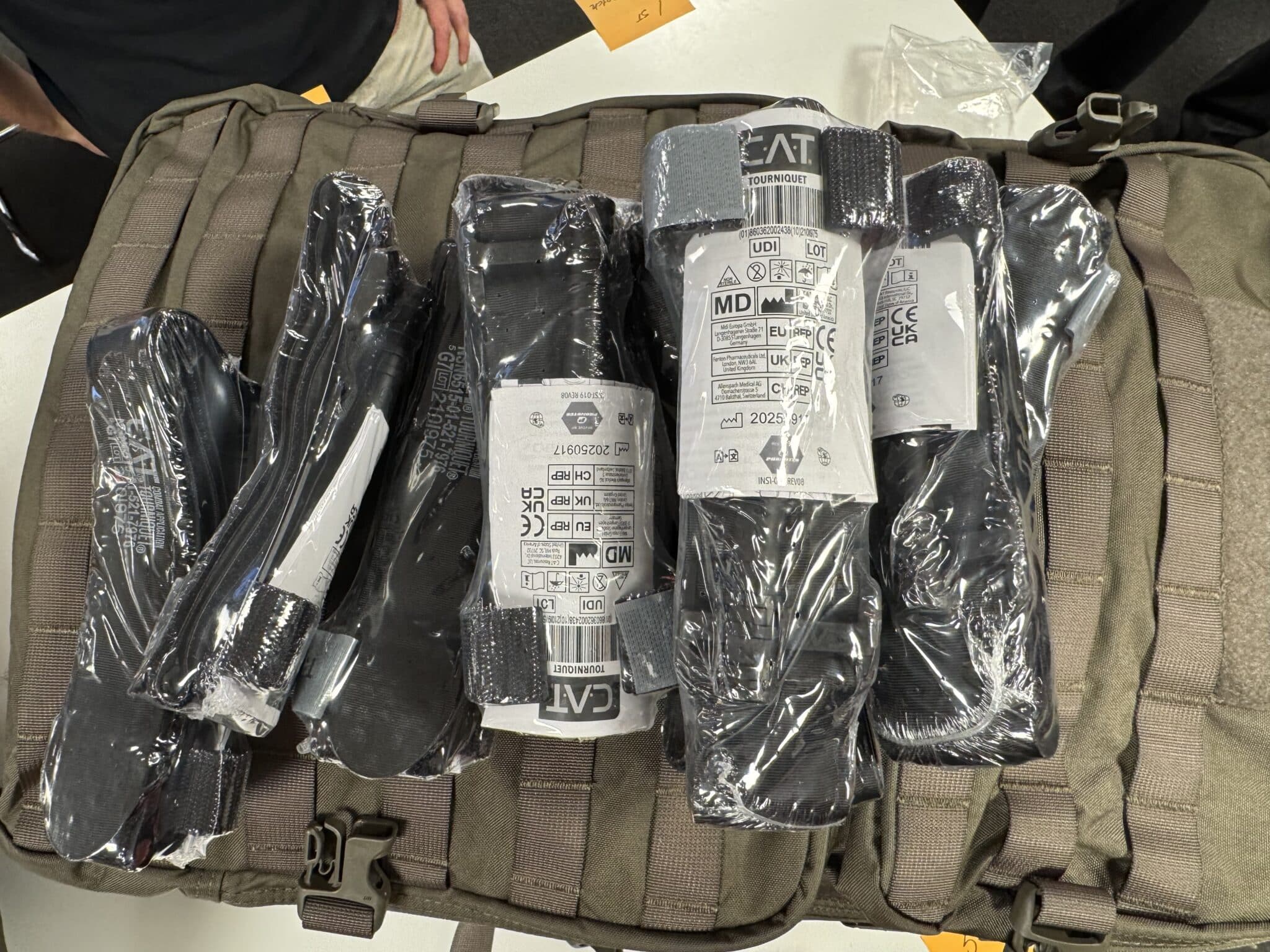 Enfin, dix garrots tourniquets sont placés dans les compartiments extérieurs de chaque sac. L’opération est soutenue par l’entreprise Apotea, qui apporte logistique, locaux et personnel pour le conditionnement. Le PDG d’Apotea a affirmé la volonté de poursuivre cette aide aussi longtemps que nécessaire, soulignant un engagement « as long as it takes ».