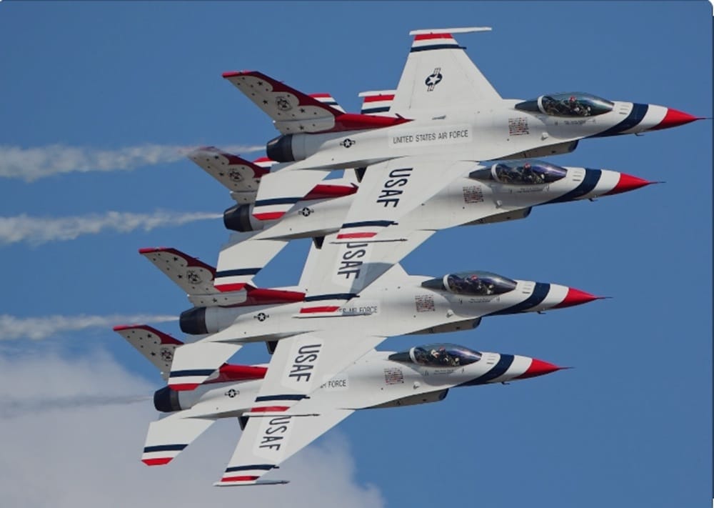 En effet, le F-16 bénéficie d’un meilleur rapport poussée/poids et d’une agilité accrues par rapport au F/A-18, ce qui permet aux Thunderbirds d’exécuter des figures inaccessibles pour les Blue Angels. Leur routine comprend par exemple des passages opposés spectaculaires à des vitesses combinées dépassant souvent les 1 600 km/h et des montées verticales impressionnantes. Les formations sont plus lâches que celles des Blue Angels, mettant davantage l’accent sur la performance individuelle des pilotes et les capacités brutes de la machine.