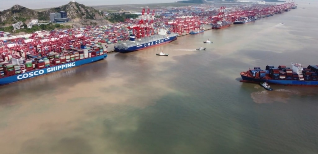 Illustration : Activités portuaires dans le port de Yangshan près de Shanghai, un centre logistique clé pour la Chine.
