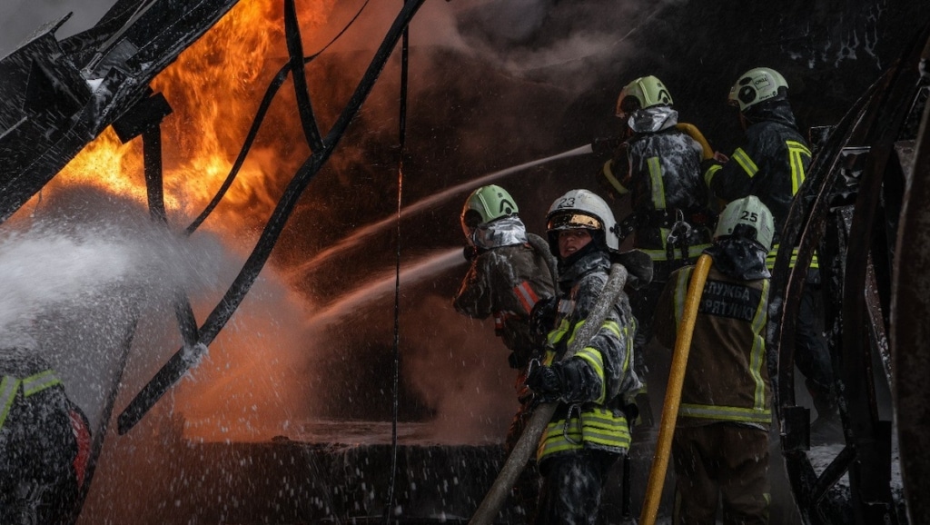 Illustration : Des pompiers ukrainiens éteignent des incendies dans la région de Poltava, conséquence des frappes russes visant les infrastructures énergétiques ukrainiennes le 16 octobre 2025.