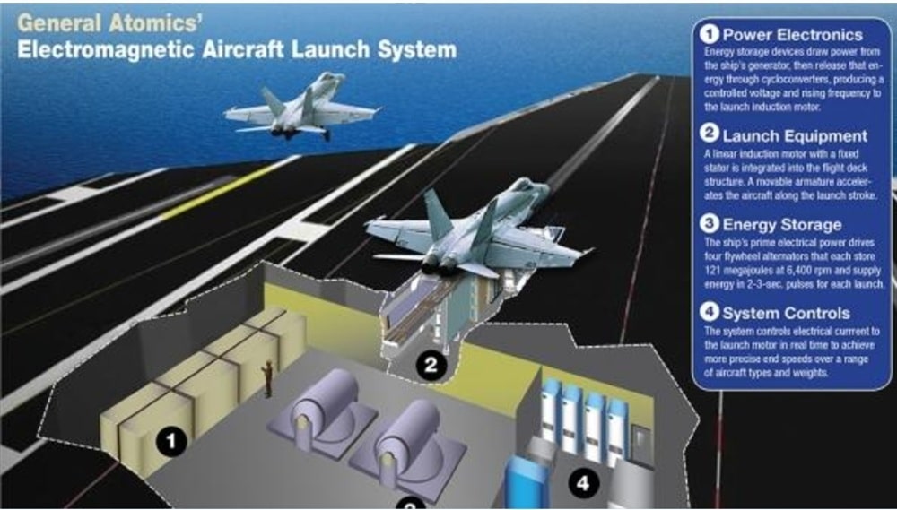 Le système électromagnétique de lancement d’aéronefs (EMALS), développé par General Atomics pour la classe Gerald R. Ford, propose plusieurs avantages par rapport aux catapultes à vapeur classiques. Fonctionnant grâce à un moteur à induction linéaire, il peut lancer des appareils plus lourds, augmenter le rythme des catapultages tout en réduisant les contraintes mécaniques et nécessitant moins d’entretien.