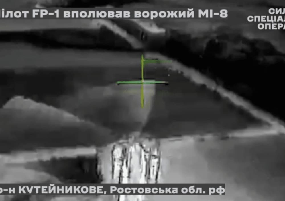 Images thermiques des Forces des Opérations Spéciales ukrainiennes montrant un drone FP-1 ciblant un hélicoptère Mi-8 russe au-dessus de Kuteinykove, région de Rostov, Russie.