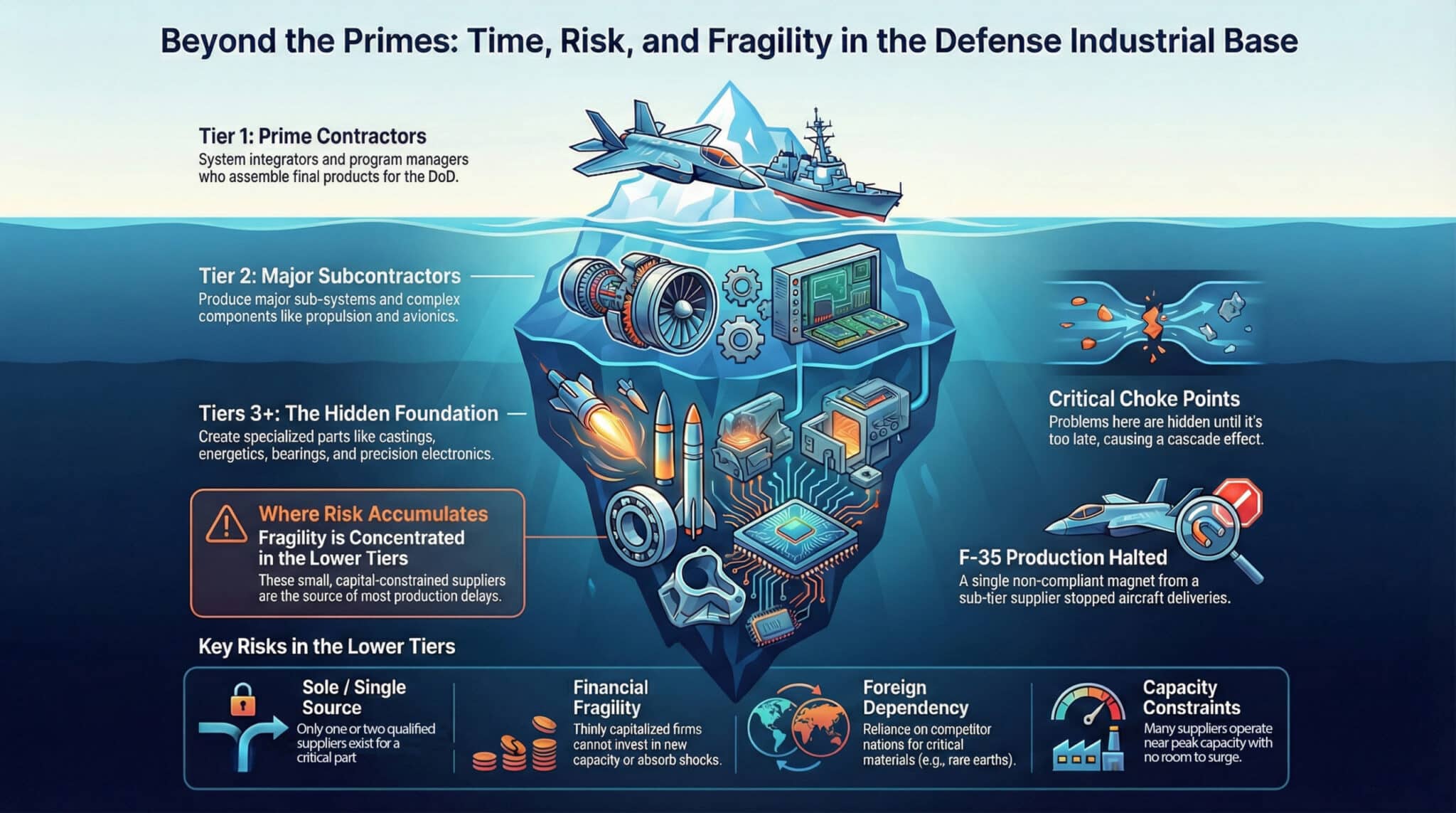 Cette représentation illustre la structure en couches de la base industrielle de défense, allant des principaux contractants au sommet jusqu’aux fournisseurs de rang inférieur qui forment son socle invisible. Si les risques au niveau des donneurs d’ordre sont visibles et font l’objet d’une gestion active, la fragilité s’accumule dans les niveaux inférieurs, où de petites entreprises aux capacités financières limitées dépendent souvent d’une seule source, disposent d’une faible capacité de montée en charge et sont exposées à des chaînes d’approvisionnement étrangères. Les perturbations à ces niveaux restent fréquemment invisibles jusqu’à ce qu’elles se propagent vers le haut, bloquant la production ou retardant la livraison de systèmes critiques.